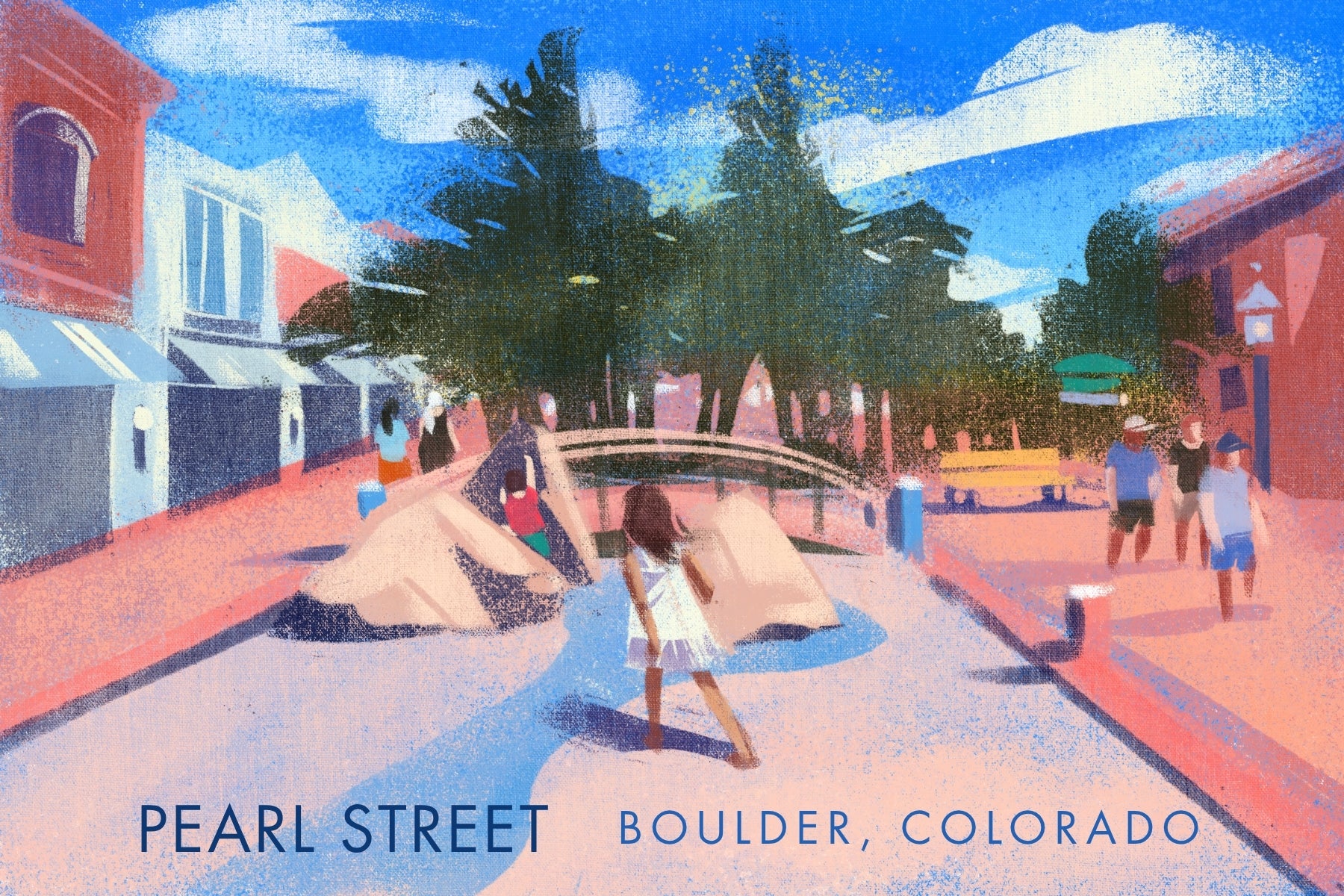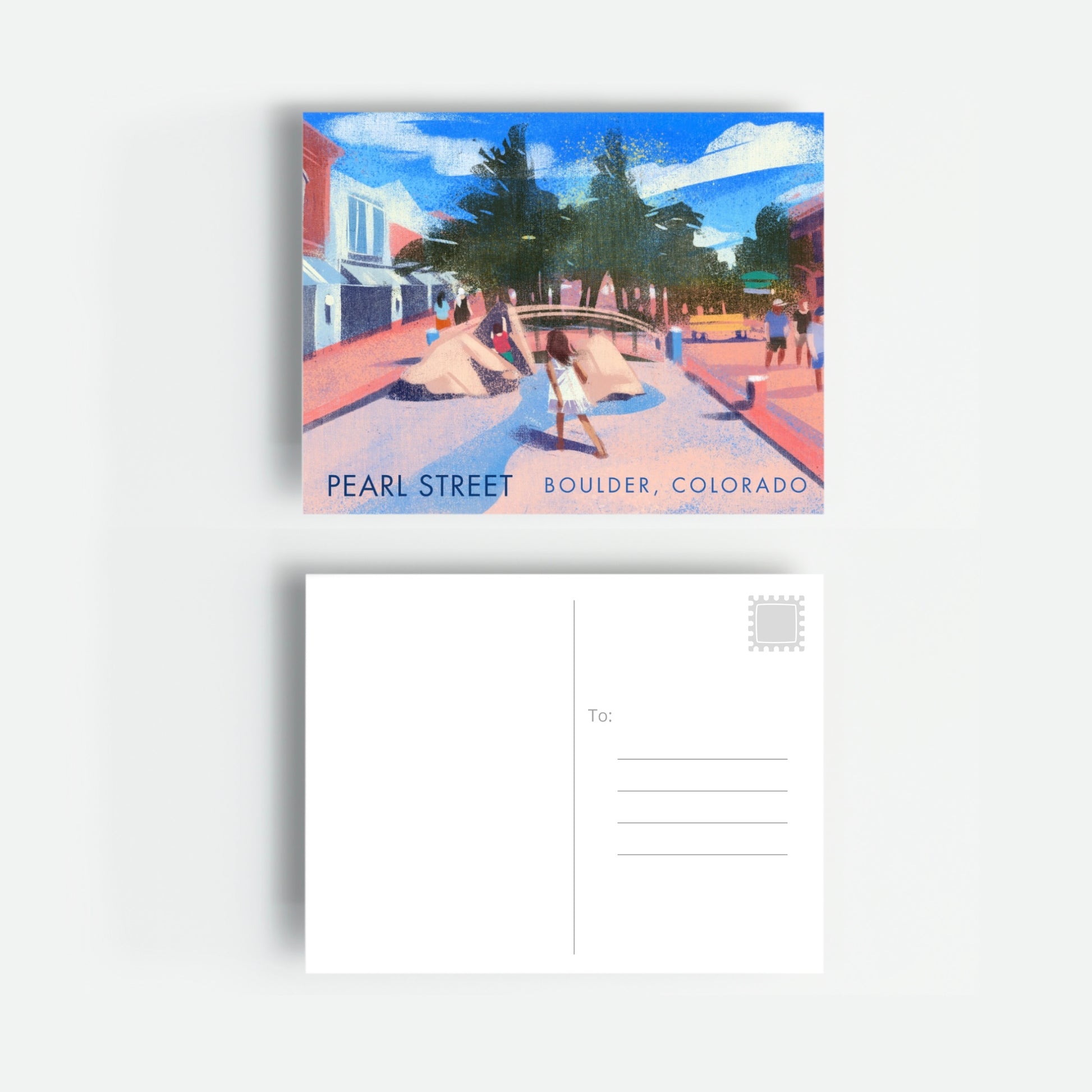 This illustrated postcard showcases Pearl Street in Boulder, Colorado, ideal for gifting, collecting, or framing as distinctive Boulder art.